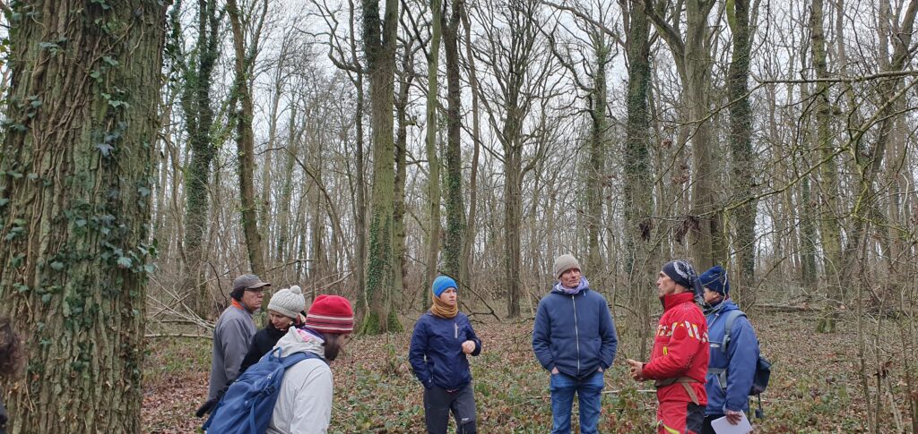 Sur la ferme de la Boulaye à Clos-Fontaine (77), deux journées techniques concernant les pratiques de gestion sylvicole des haies ont été organisées par Agrof’île le 15 et 20 Janvier 2026. La première journée était dédiée à la reconnaissance et au marquage des arbres à récolter ou à préserver. Nous avons visité différentes structures ligneuses (haies, berge de mare, bois, ripisylves) pour reconnaître des essences valorisables et étudier des possibilités de valorisation du bois présent dans ces haies agricoles. La deuxième journée technique était dédiée aux techniques de récolte des arbres sur un chantier de gestion sylvicole pour effectuer un recépage afin de rajeunir une bande boisée dont le taillis est arrivé à maturité (plus de 40 ans depuis la dernière coupe) au nord de la ferme.