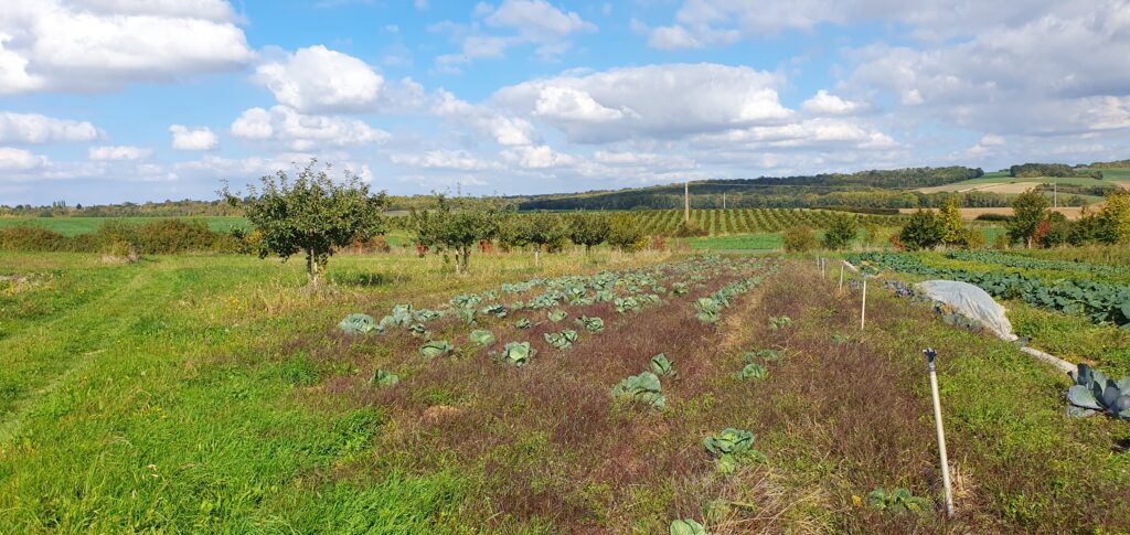 Chez Florian Gamé et Anne Rollin à Thénisy (77), la ferme est en production de céréales et de maraîchage. La parcelle de maraîchage extensive et biologique de 7 ha est bordée de haies plantées en 2007 à l’aide des adhérents de l’AMAP, avec des jeunes plants de lisière forestière. Une haie fruitière et des alignements de pommiers, de robiniers et de tilleuls inter parcellaires, implantés depuis 2020 par Agrof’île. Ceci dans l’objectif de protéger le maraîchage du vent (éviter les déchirements de bâche de tunnels), d’avoir des plus petites parcelles, dans lesquelles ils trouvent leur travail plus agréable. Suite à la mise en place, les maraîchers ont pu rapidement observer les impacts bénéfiques des haies brise-vent, comme la réduction de l’arrêt de croissances et de dégâts sur des légumes (plants de courgettes cassés par exemple). Des effets positifs sur la régulation des ravageurs ont été notés, comme des chenilles et mouches. Néanmoins, il y a toujours une pression par des limaces, qui trouvent leurs habitats dans les herbes hautes entre les arbres. Les agriculteurs étaient très reconnaissants et ravis de la collaboration avec Agrof’île pour leurs projets agroforestières sous forme de verger-maraîcher. Cet accompagnement leur a permis de se mettre en action dans une logique d’action paysanne et empirique. Avec ce projet, Florian et Anne partagent la vision d’une agriculture qui marche, car elle est intégrée dans un écosystème sain. La prochaine étape est le pâturage autour des pieds des pommiers par 3 moutons dans des enclos temporaires.